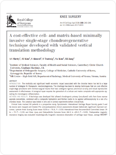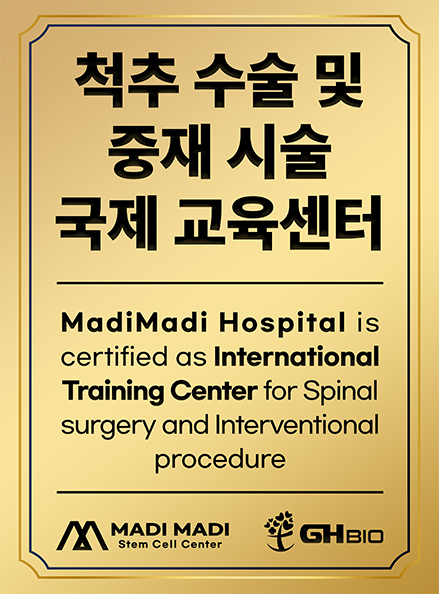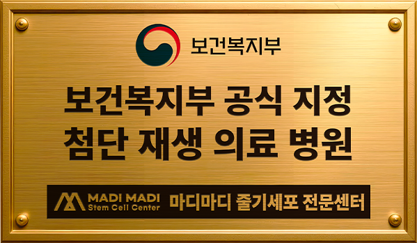 LICENSE 줄기세포 치료 연구 및 임상 근거 보건복지부 지정첨단재생의료 실시기관 본 의료기관은 보건복지부가 인증한 첨단재생의료 실시기관으로,국가가 인정한 재생의료법에 따른 관리·감독 체계 하에서보다 안전하고 신뢰할 수 있는 줄기세포 치료를 시행합니다. Research-Based Stem Cell Therapy 줄기세포 치료의 과학적 연구 기반 줄기세포 치료는 손상된 조직의 회복과 기능 개선 가능성에 대해다양한 연구가 진행되고 있는 분야로, 학술 논문들을 통해 세포의재생 잠재력과 염증 조절, 미세환경 개선과 관련된 생물학적 기전들이학술적으로 보고되었습니다. 다만 치료 반응은 개인의 건강 상태와 질환 단계, 적용 방법 등에 따라차이가 있을 수 있습니다. 마디마디 줄기세포 치료센터는 발표된 연구 자료와 임상적 근거를바탕으로 안전 기준과 프로토콜을 준수하며 치료를 진행하고,환자 상태를 고려한 의료진 상담을 통해 신중하게 접근하고 있습니다. 무릎 연골 손상 환자에서 PRP 주사 치료 효과 연구 PRP의 중추신경계 질환 치료 가능성 연구 자가 골수 줄기세포의 무릎 연골재생 효과 연구 PRP와 미세천공 병합 치료의 무릎 연골재생 효과 연구 단일단계 세포·기질 기반 연골재생 기법 개발 연구 CD34 + 세포 함유 PRP의 탈모 치료 효과 연구 어깨 회전근개 수술 후 PRP 주입의 치유 효과 연구 무릎 연골결손 모델에서 PRP와 미세천공술 병합 시 연골재생 효과 향상 확인 무릎 내측 관절염에서 교정 절골술 (HFO)과 연골재생 병합치료의 임상 효과 평가